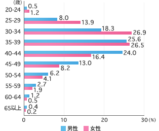 ちなみに45歳から49歳の割合は男性が13%、女性が8.2%となっていますので人数にすると男性が2,600人程度、女性が1,700人程度となっています。